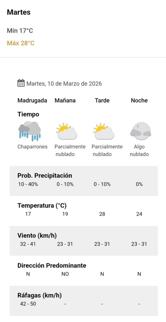 De acuerdo al parte del Servicio Meteorológico Nacional, el clima presenta una probabilidad de lluvia del 10 por ciento, y los vientos del noroeste correrán a una velocidad de entre 23 y 31 kilómetros por hora. La humedad sería del 83 por ciento, y la visibilidad sería buena.