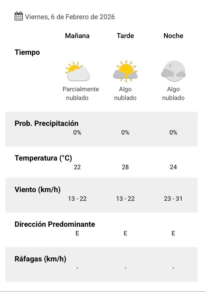 El parte del servicio meteorológico prevé que para después del mediodía el cielo estará parcialmente nublado y los vientos del sector este tendrán velocidades estimadas de entre 13 y 22 km/h. La temperatura pronosticada sería de 29 grados.