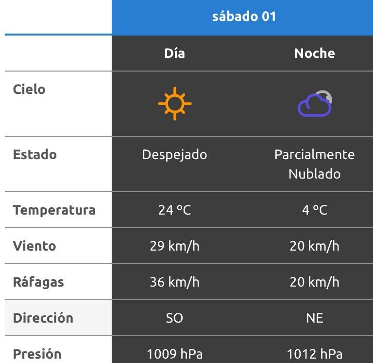 El parte del servicio meteorológico prevé que para después del mediodía el cielo estará algo nublado y los vientos del sector sudoeste tendrán velocidades estimadas entre 23 y 31 km/h. La temperatura pronosticada sería de 25 grados.