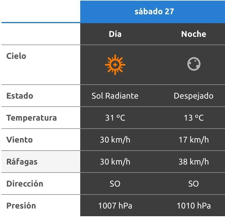 El parte del servicio meteorológico prevé que para después del mediodía el cielo estará ligeramente nublado y los vientos del sector sudoeste tendrán velocidades estimadas entre 23 y 31 km/h. La temperatura pronosticada sería de 30 grados.