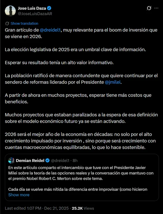 En declaraciones difundidas en redes sociales, Daza destacó que las elecciones legislativas de octubre fueron “un umbral clave de información”, en tanto la población ratificó “de manera contundente” el rumbo de reformas liderado por el presidente Javier Milei. “A partir de ahora, en muchos proyectos esperar tiene más costos que beneficios. Muchos que estaban paralizados ya se están activando”, afirmó.