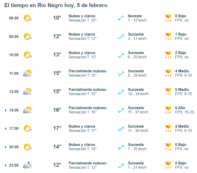 El pronóstico del tiempo para la ciudad de Río Negro, indica que hoy 5 de febrero el cielo estará parcialmente nublado por la mañana y la temperatura rondará entre 6 grados.