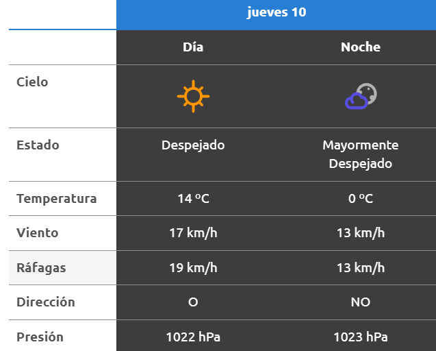 A la noche, el clima rondará los 0 grados, mientras que los vientos serán del sur a una velocidad de 7 y 12 kilómetros por hora. No se esperan lluvias para esta franja del día.