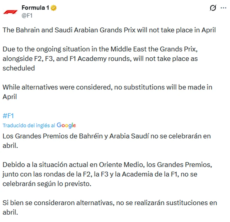 La Fórmula 1 anunció que los Grandes Premios de Bahréin y Arabia Saudita, previstos para el 12 y 19 de abril, no se disputarán debido a la escalada del conflicto en Medio Oriente entre Estados Unidos, Israel e Irán. La organización confirmó la suspensión a través de sus redes sociales y aclaró que no habrá reemplazos para estas fechas, reduciendo así el calendario de la temporada.