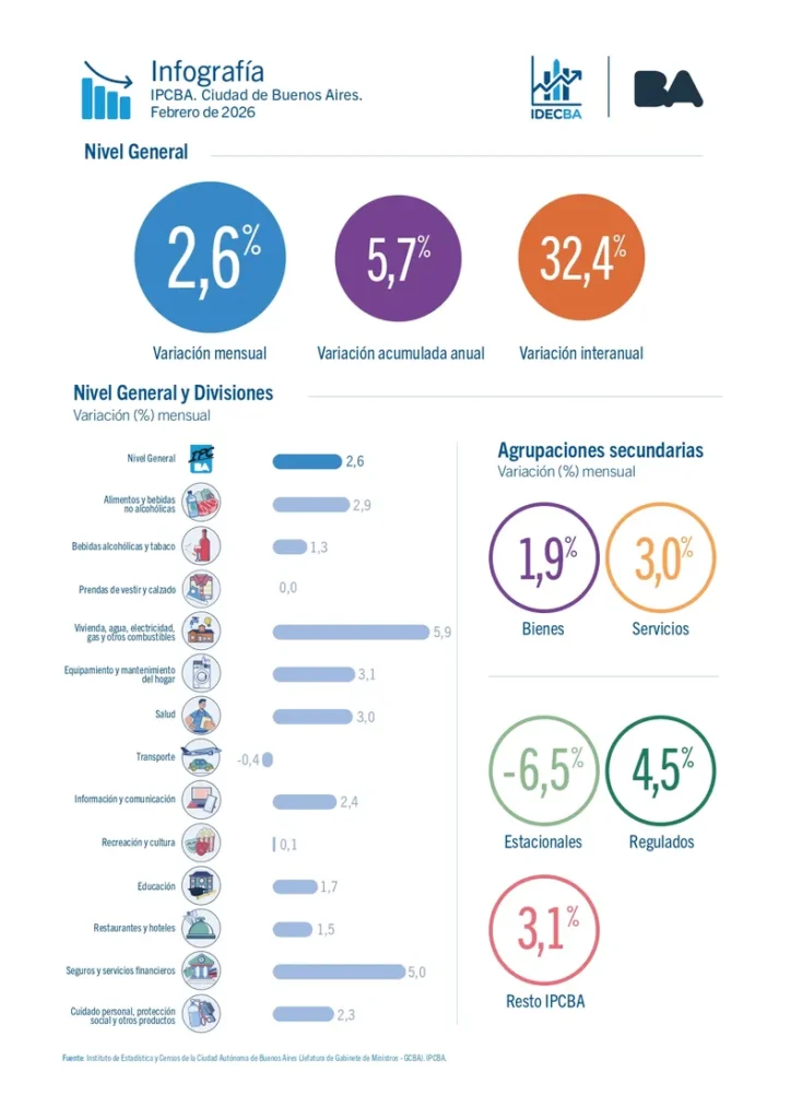 La inflación en la Ciudad de Buenos Aires cerró febrero en 2,6%, mostrando una desaceleración frente al 3,1% de enero, según informó el Instituto de Estadística porteño. Con este registro, el primer bimestre acumuló un aumento de precios de 5,7%, mientras que la variación interanual alcanzó el 32,4%, según el informe procesado por medios.