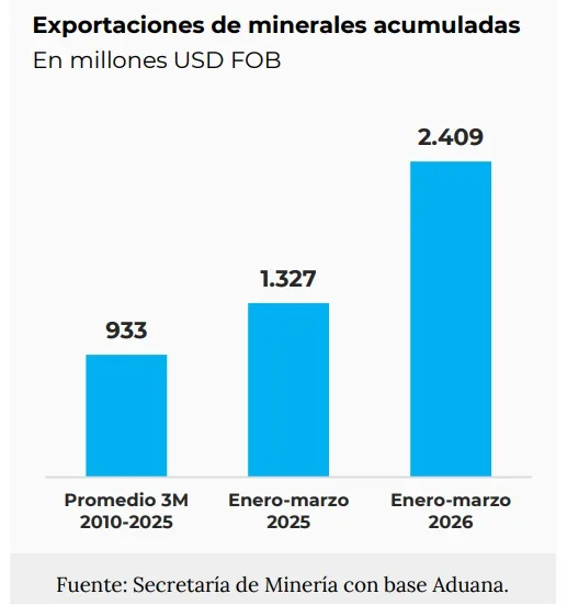 Las exportaciones mineras de Argentina alcanzaron un nivel récord en el primer trimestre de 2026. Según el último Informe Mensual del sector, en marzo se registraron ventas por US$ 830 millones, lo que llevó el acumulado trimestral a US$ 2.409 millones.