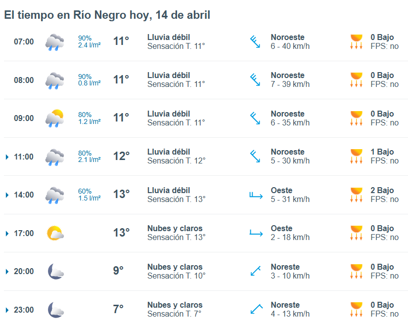 El pronóstico del tiempo para la ciudad de Río Negro, indica que hoy 14 de abril el cielo estará con lluvias fuertes por la mañana y la temperatura rondará entre 11 grados.