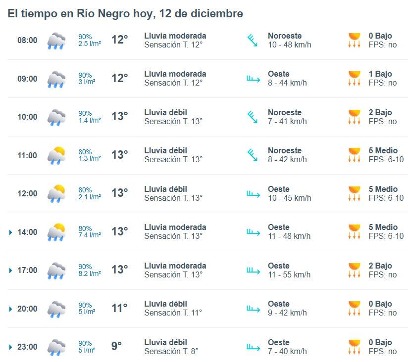El pronóstico del tiempo para la ciudad de Río Negro, indica que hoy 12 de diciembre el cielo estará con lluvias aisladas por la mañana y la temperatura rondará entre 14 grados.