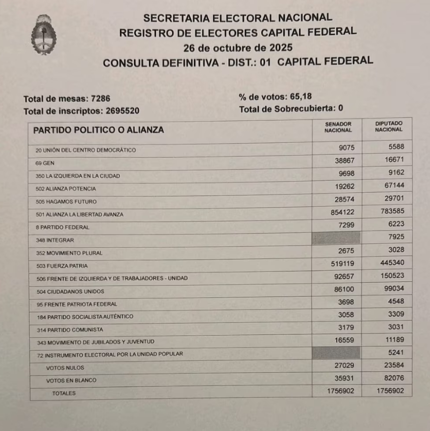 Según los resultados oficiales del recuento definitivo, La Libertad Avanza alcanzó 783.585 votos para la categoría de diputados y 854.122 para senadores. Fuerza Patria cosechó 445.340 sufragios en la categoría de diputados y 519.119 para el Senado. En tanto, el Frente de Izquierda sumó 150.523 votos, y la coalición de Lousteau, Ciudadanos Unidos, obtuvo 99.034 para la Cámara baja y 86.100 para la alta.
