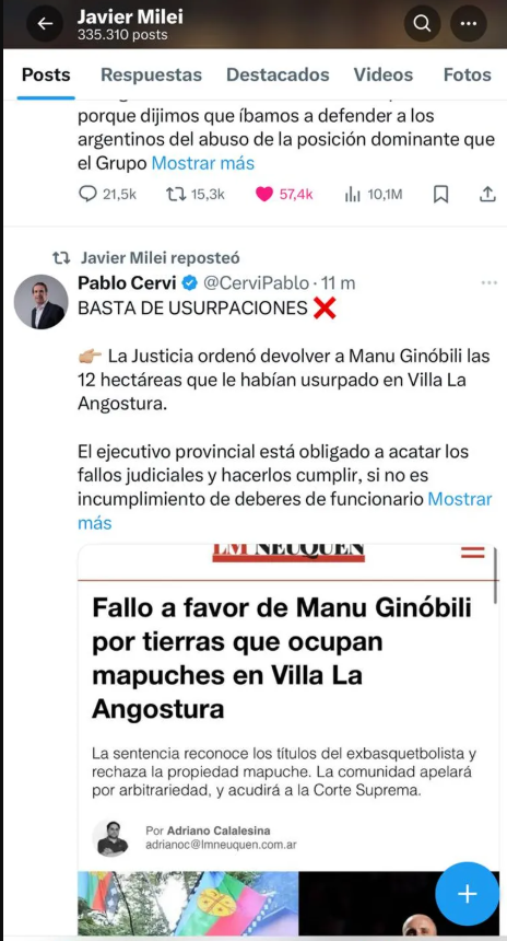 “La Justicia ordenó devolver a Manu Ginóbili las 12 hectáreas que le habían usurpado en Villa La Angostura. Defender la propiedad privada es esencial para dar certezas, atraer inversiones y construir una Argentina en crecimiento”, escribió.