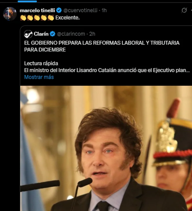 Marcelo Tinelli sorprendió en redes sociales al manifestar su respaldo a la reforma laboral y tributaria impulsada por el presidente Javier Milei. A través de su cuenta de X, el conductor televisivo y actualmente enfocado en proyectos de streaming, compartió la noticia acompañada de emojis de aplausos y la palabra “excelente”.
