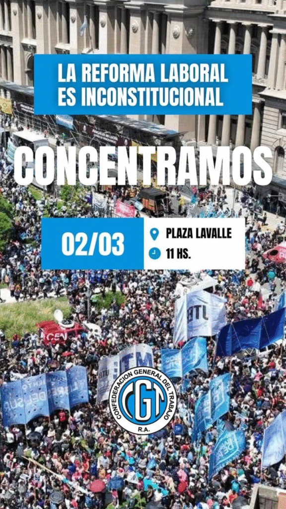 La Confederación General del Trabajo (CGT) se movilizará este lunes 2 de marzo hacia el Palacio de Tribunales para rechazar la reforma laboral impulsada por Javier Milei, recientemente convertida en ley. Además de la protesta, la central obrera presentará un recurso judicial para intentar frenar su aplicación.