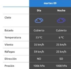 Para después del mediodía el cielo estará con lluvias fuertes y los vientos serán del noroeste y correrán a una velocidad estimada de entre 7 a 12 km/h. La temperatura pronosticada sería de 6 grados. A la noche, el clima rondará los 4 grados, mientras que los vientos serán del noroeste a una velocidad de entre 23 y 31 kilómetros por hora. La probabilidad de lluvia estaría en el orden del entre 40 y 70 por ciento para esta franja del día.