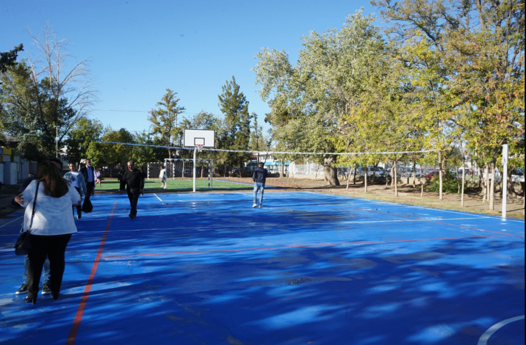 En el exterior, se niveló el terreno y se construyó un playón deportivo y una cancha de césped sintético, se instalaron nuevos juegos y se reforzó la seguridad de los espacios recreativos.