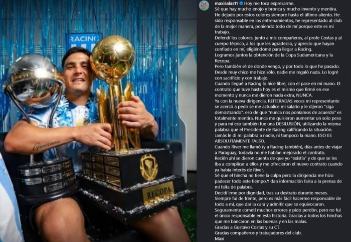 “Cuando llegué a Racing lo hice libre, con el pase en mi mano. El contrato que tuve hasta hoy es el mismo que firmé en ese momento y nunca me dieron nada extra, NUNCA”, escribió Salas.