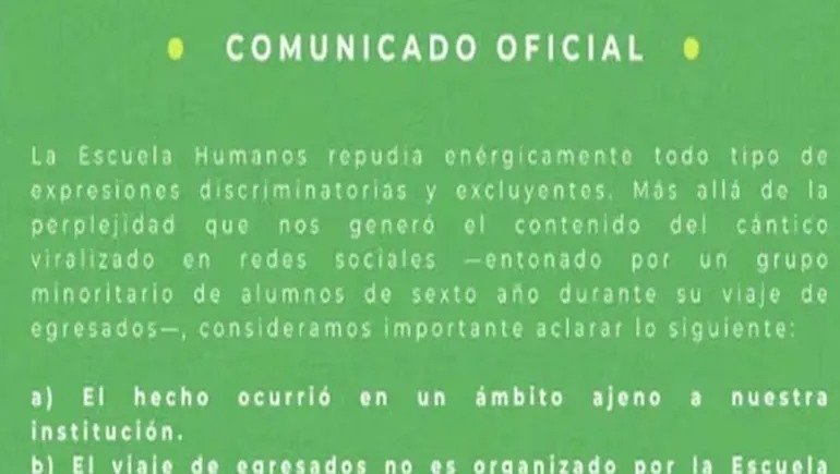 Luego de que se viralizara un video en el que un grupo de alumnos canta frases antisemitas durante su viaje de egresados, la Escuela Humanos, ubicada en Canning ,provincia de Buenos Aires, difundió un comunicado oficial para aclarar su posición y detallar las primeras decisiones institucionales.