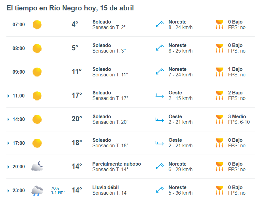 El pronóstico del tiempo para la ciudad de Río Negro, indica que hoy 15 de abril el cielo estará algo nublado por la mañana y la temperatura rondará entre 4 grados.
