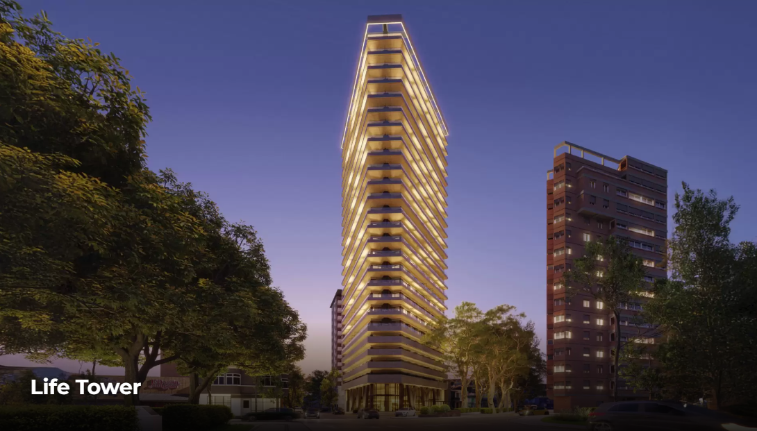 El proyecto, denominado Life Tower y desarrollado por Safiar, propone un formato híbrido que combina unidades residenciales premium con una oferta gastronómica. El edificio se levanta en la intersección de Avenida Argentina y Belgrano, en una zona céntrica con fuerte actividad comercial y gastronómica.