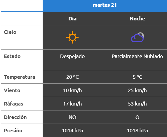 El parte del servicio meteorológico prevé que para después del mediodía el cielo estará algo nublado y los vientos del sector oeste tendrán velocidades estimadas de entre 13 y 22 km/h. La temperatura pronosticada sería de 17 grados.