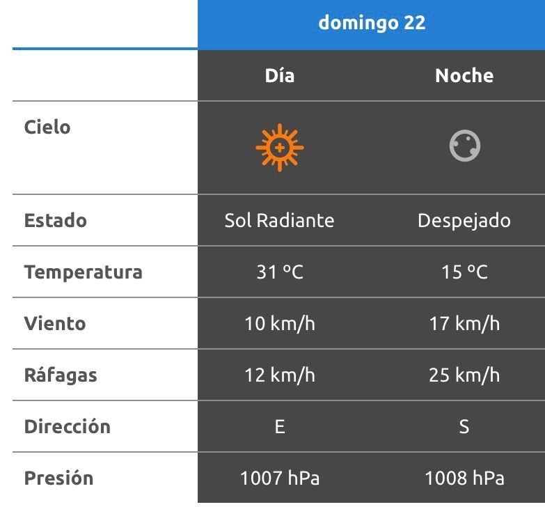 El parte del servicio meteorológico prevé que para después del mediodía el cielo estará parcialmente nublado y los vientos del sector norte tendrán velocidades estimadas de entre 13 y 22 km/h. La temperatura pronosticada sería de 32 grados.