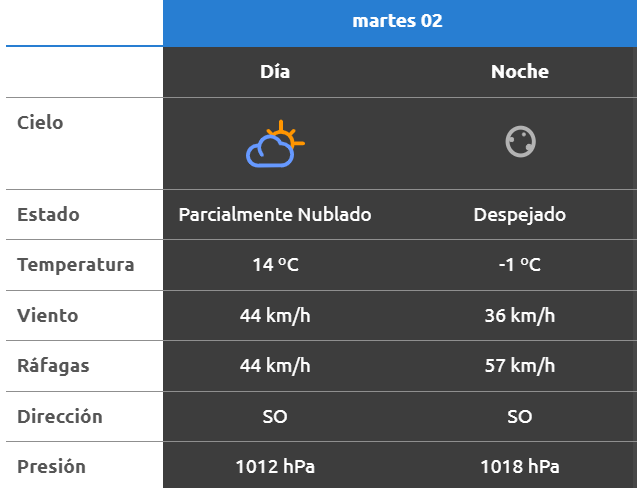 El parte del servicio meteorológico prevé que para después del mediodía el cielo estará mayormente nublado y los vientos del sector sudoeste tendrán velocidades estimadas entre 23 y 31 km/h. La temperatura pronosticada sería de 14 grados.