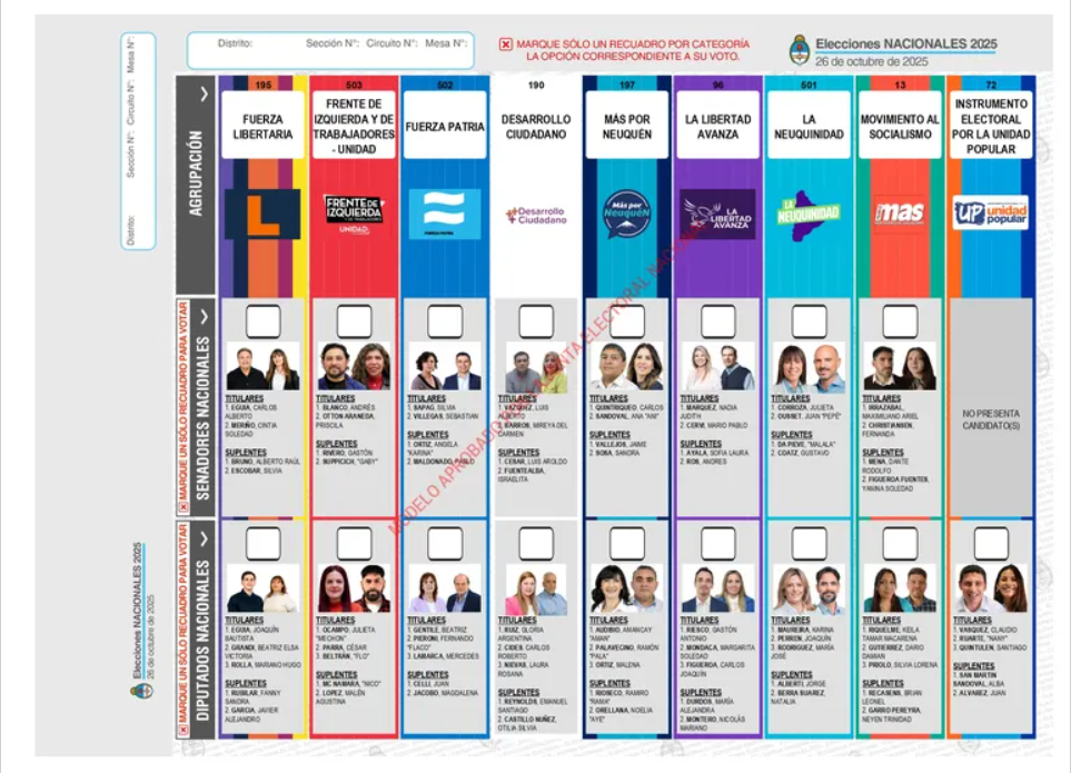 La BUP presenta en dos tramos separados las categorías en disputa, con nombre de la agrupación, logos, colores y fotografía de los candidatos, junto a un casillero para marcar la preferencia. El orden de los partidos fue definido mediante sorteo público. Participarán seis partidos y tres alianzas, desde el oficialismo provincial hasta partidos nacionales, sindicatos y espacios de izquierda.