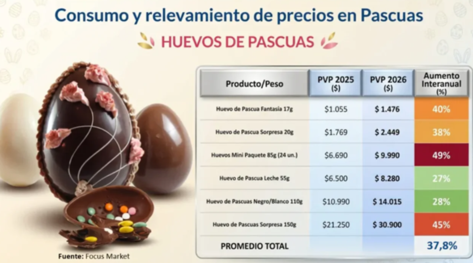 Los huevos de chocolate también reflejan esta tendencia. El paquete de 24 mini huevos subió un 49%, mientras que el clásico huevo sorpresa de 150 gramos aumentó un 45%. Otras presentaciones registraron subas de entre el 27% y el 40%, y los huevos rellenos —cada vez más populares— alcanzaron incrementos del 36%.