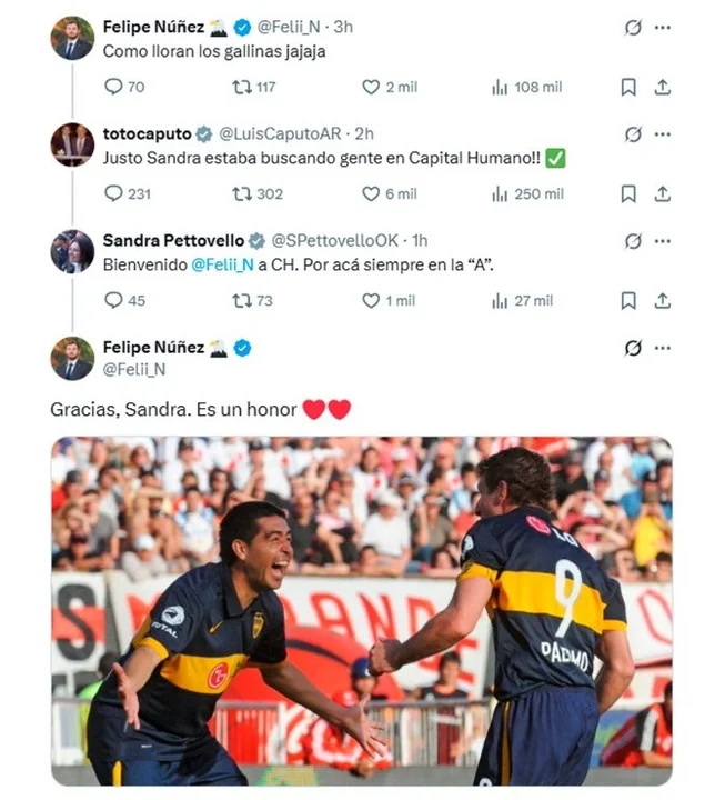 El ministro de Economía, Luis Caputo -reconocido hincha del Millonario-, recogió el guante y le contestó con humor: “Justo Sandra (Pettovello) estaba buscando gente en Capital Humano!!”, arrobando a su compañera del Gabinete.
