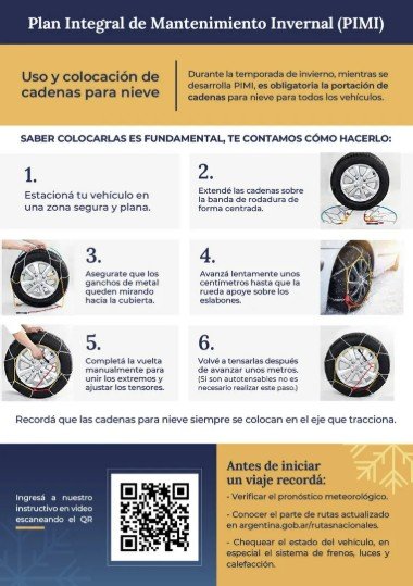Durante la temporada invernal, es obligatorio circular con cadenas en rutas afectadas por hielo o nieve. Vialidad Nacional recomienda familiarizarse con su colocación para evitar inconvenientes.
