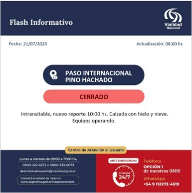 El paso fronterizo Pino Hachado se cerró este lunes por acumulación de nieve y hielo en la calzada. Así lo informó Vialidad Nacional a través de un parte oficial emitido a primera hora de la mañana. El tránsito está completamente interrumpido y los equipos continúan trabajando en el despeje.