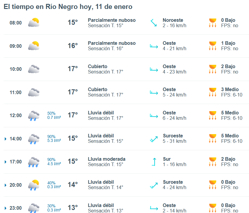 El pronóstico del tiempo para la ciudad de Río Negro, indica que hoy 11 de enero el cielo estará mayormente nublado por la mañana y la temperatura rondará entre 15 grados.