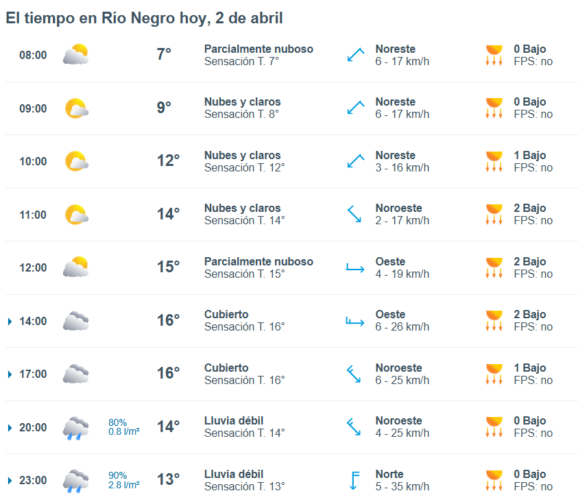 El pronóstico del tiempo para la ciudad de Río Negro, indica que hoy 2 de abril el cielo estará mayormente nublado por la mañana y la temperatura rondará entre 6 grados.