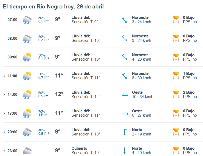 El pronóstico del tiempo para la ciudad de Río Negro, indica que hoy 29 de abril el cielo estará mayormente nublado por la mañana y la temperatura rondará entre 6 grados.