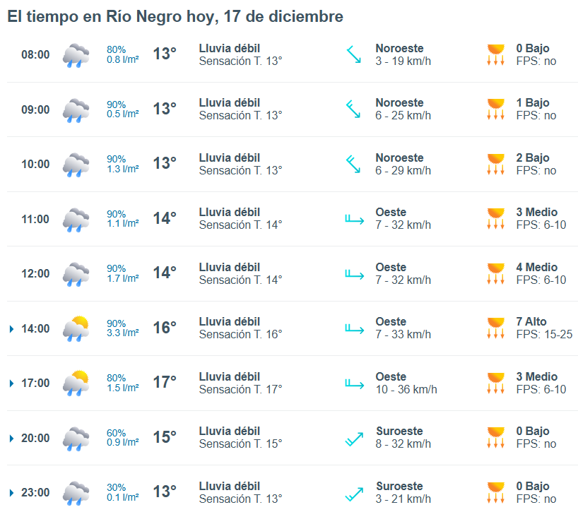 El pronóstico del tiempo para la ciudad de Río Negro, indica que hoy 17 de diciembre el cielo estará parcialmente nublado por la mañana y la temperatura rondará entre 14 grados.