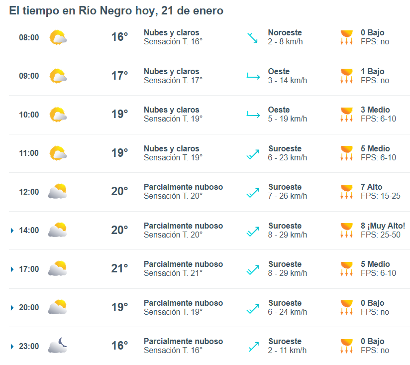 El pronóstico del tiempo para la ciudad de Río Negro, indica que hoy 21 de enero el cielo estará algo nublado por la mañana y la temperatura rondará entre 18 grados.