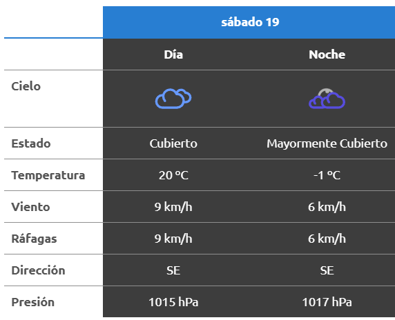 El parte del servicio meteorológico prevé que para después del mediodía el cielo estará mayormente nublado y los vientos del sector oeste tendrán velocidades estimadas de entre 23 y 31 km/h. La temperatura pronosticada sería de 16 grados.