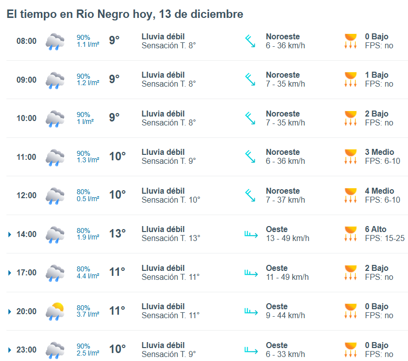 El pronóstico del tiempo para la ciudad de Río Negro, indica que hoy 13 de diciembre el cielo estará con lluvias aisladas por la mañana y la temperatura rondará entre 10 grados.