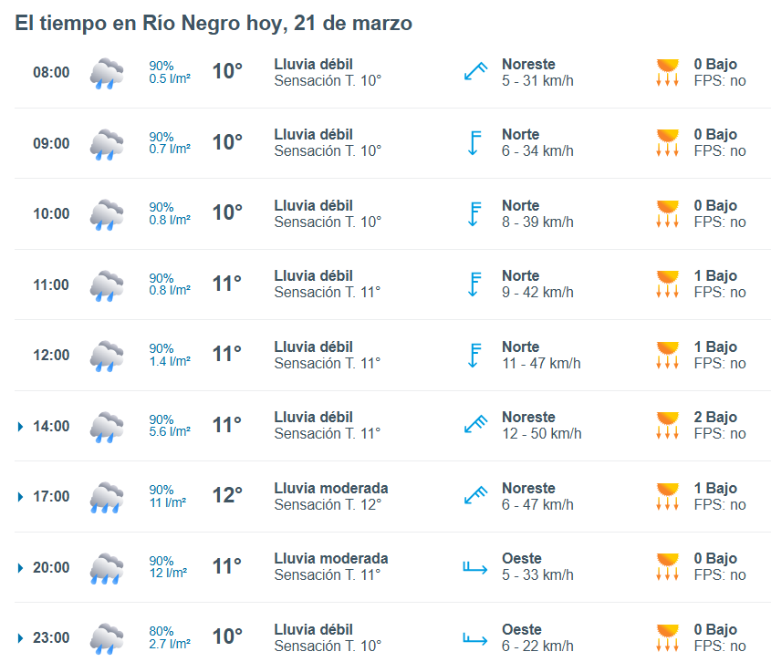 El pronóstico del tiempo para la ciudad de Río Negro, indica que hoy 21 de marzo el cielo estará con lloviznas por la mañana y la temperatura rondará entre 7 grados.
