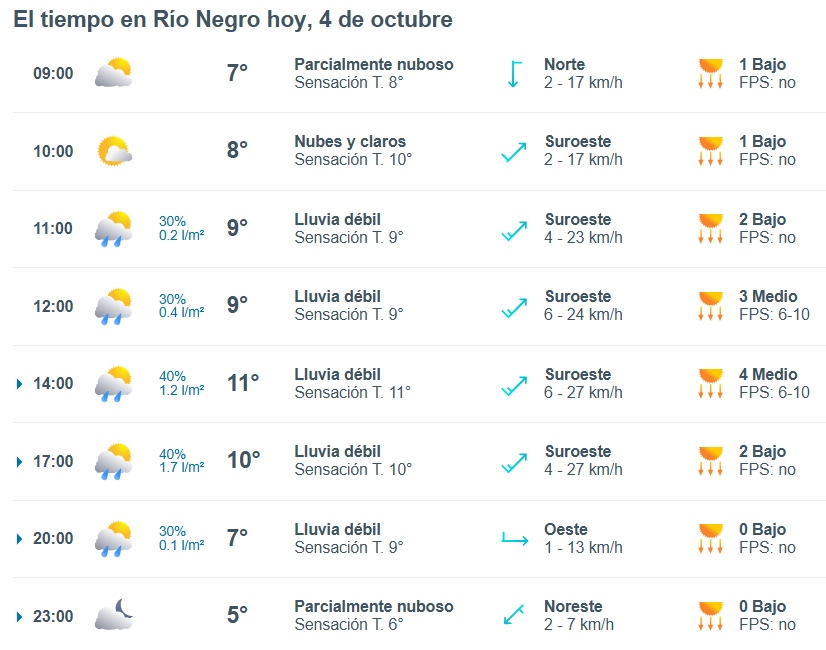 El pronóstico del tiempo para la ciudad de Río Negro, indica que hoy 4 de octubre el cielo estará con tormentas aisladas por la mañana y la temperatura rondará entre 18 grados.