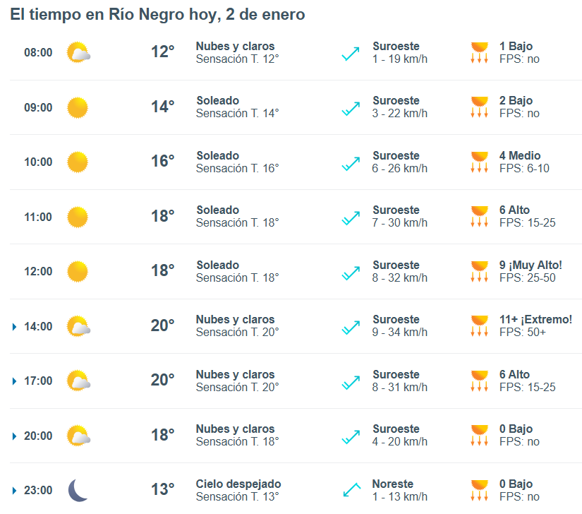 El pronóstico del tiempo para la ciudad de Río Negro, indica que hoy 2 de enero el cielo estará ligeramente nublado por la mañana y la temperatura rondará entre 14 grados.