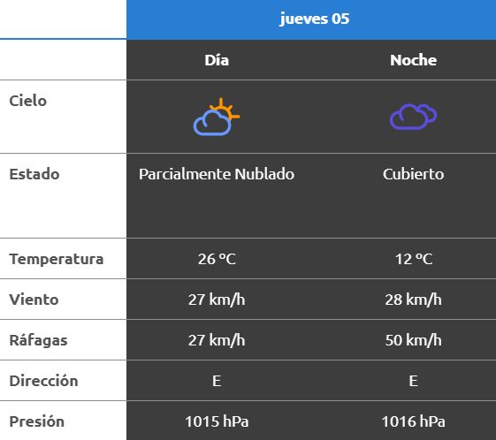 El parte del servicio meteorológico prevé que para después del mediodía el cielo estará parcialmente nublado y los vientos del sector noreste tendrán velocidades estimadas de entre 23 y 31 km/h. La temperatura pronosticada sería de 25 grados.