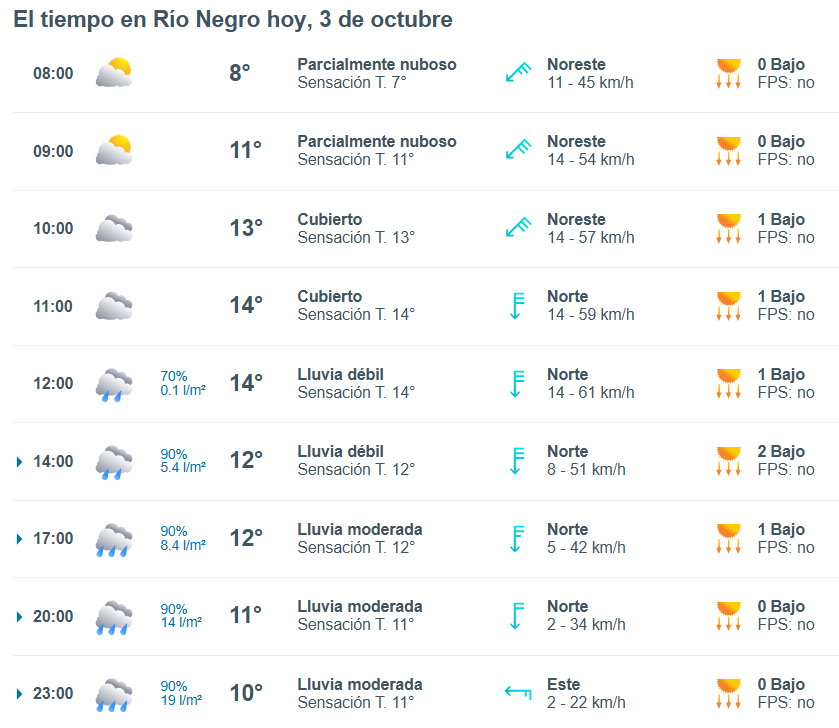 De acuerdo al parte del Servicio Meteorológico Nacional, el clima en esta ciudad de Río Negro se presentaría sin lluvias, y los vientos del noroeste correrán a una velocidad de entre 23 y 31 kilómetros por hora. La humedad sería del 52 por ciento, y la visibilidad sería buena.
