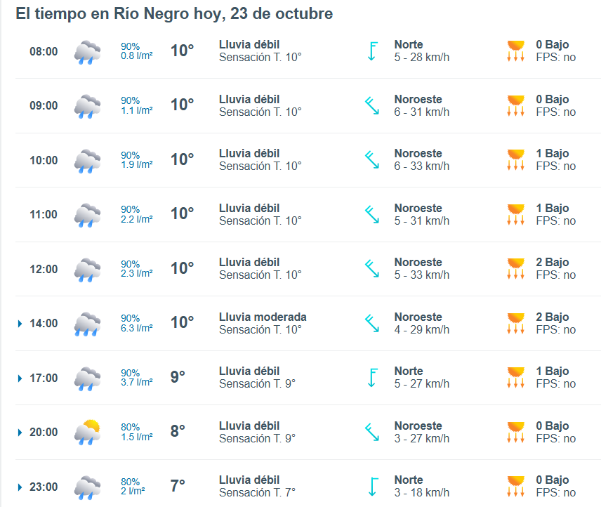 El pronóstico del tiempo para la ciudad de Río Negro , indica que hoy 23 de octubre el cielo estará con lluvias aisladas por la mañana y la temperatura rondará entre 13 grados.