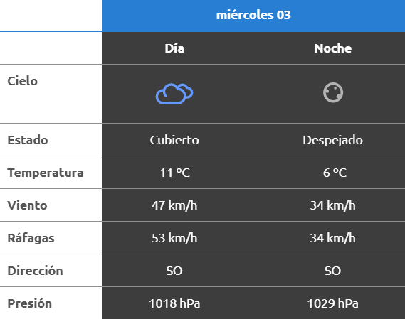 El parte del servicio meteorológico prevé que para después del mediodía el cielo estará con lluvias aisladas y los vientos del sector sur tendrán velocidades estimadas de entre 32 y 41 km/h. La temperatura pronosticada sería de 13 grados.