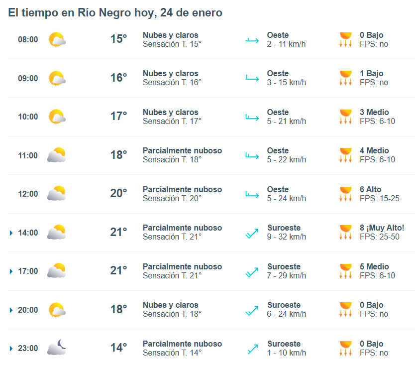 El pronóstico del tiempo para la ciudad de Río Negro, indica que hoy 24 de enero el cielo estará algo nublado por la mañana y la temperatura rondará entre 11 grados.
