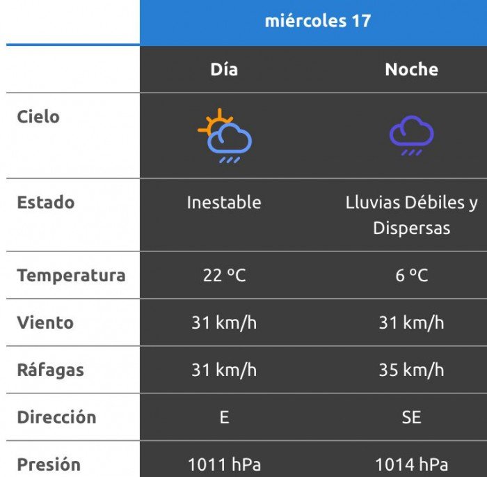 De acuerdo al parte del Servicio Meteorológico Nacional, el clima se presentaría sin lluvias, y los vientos del sudeste correrán a una velocidad de entre 13 y 22 kilómetros por hora. La humedad sería del 64 por ciento, y la visibilidad sería buena.