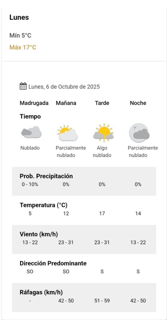 Después del mediodía el cielo estará algo nublado y los vientos del sector sudoeste tendrán velocidades estimadas de entre 32 y 41 km/h. La temperatura pronosticada sería de 22 grados. A la noche, el clima rondará los 15 grados, mientras que los vientos serán del sudoeste y correrán a una velocidad de entre 23 y 31 kilómetros por hora. La probabilidad de lluvia estaría en el orden del por ciento para esta franja del día.