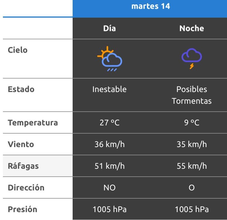 El parte del servicio meteorológico prevé que para después del mediodía el cielo estará parcialmente nublado y los vientos del sector oeste tendrán velocidades estimadas entre 32 y 41 km/h. La temperatura pronosticada sería de 27 grados.