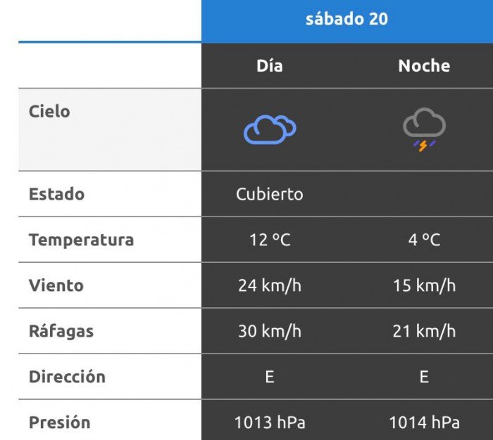 A la noche, el clima rondará los 8 grados, mientras que los vientos serán del noreste y soplarán a una velocidad de entre 13 y 22 kilómetros por hora. La probabilidad de lluvia estaría en el orden entre el 10 y 40 por ciento para esta franja del día.