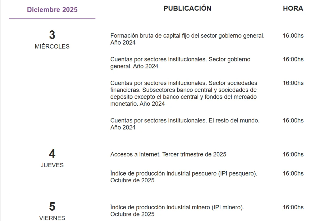 En paralelo, el INDEC difundirá distintos indicadores a lo largo de la semana, incluyendo el índice de producción industrial pesquero (IPI pesquero) y el índice de producción industrial minero (IPI minero), ambos correspondientes a octubre. El Índice de Precios al Consumidor (IPC) de noviembre se conocerá el jueves 11 de diciembre, con previsiones de mantener la inflación por encima del 2%.